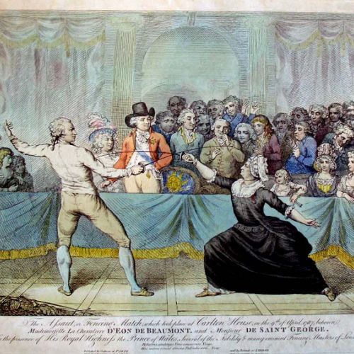 Satire of the fencing duel between "Monsieur de Saint-George and Mademoiselle la chevalière d'Éon de Beaumont" at Carlton House on April 9, 1787. Engraving by Victor Marie Picot based on the original work by Charles Jean Robineau