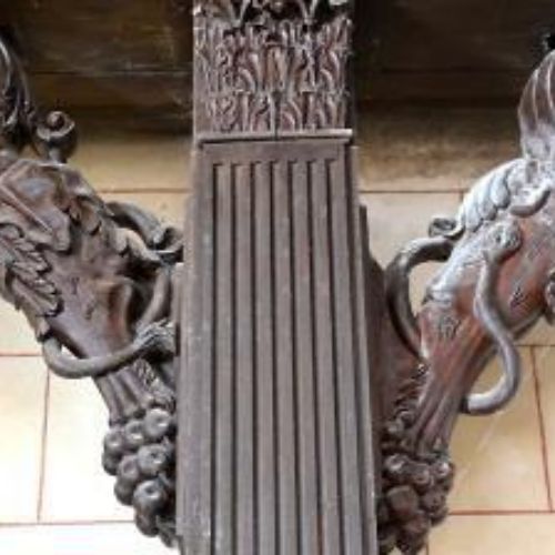 Las figuras consisten en una cabeza de hombre con bigote sobre un busto de mujer alada que termina en una cola de león azotando y patas con garras. Situado originalmente al fondo de la nave, fue trasladado en 1847 al fondo de la nave, frente al altar mayor. En esta nueva posición, oculta la ubicación del portal románico del siglo XII, que se incorporó al muro oeste.