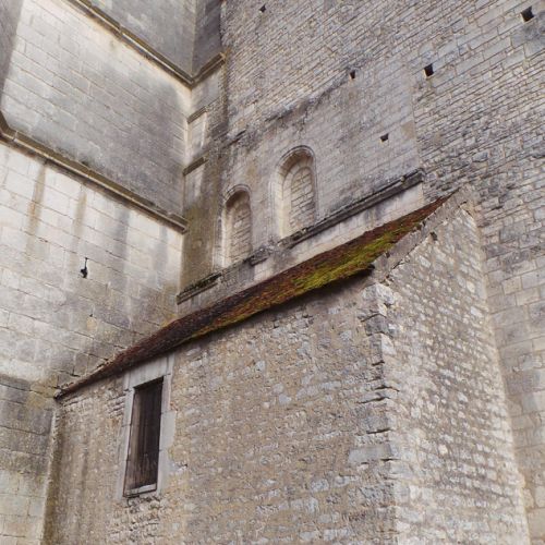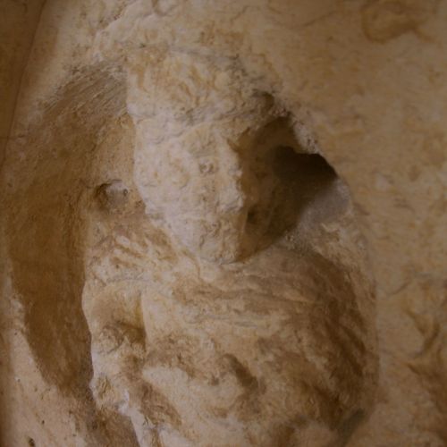 Las figuras consisten en una cabeza de hombre con bigote sobre un busto de mujer alada que termina en una cola de león azotando y patas con garras. Situado originalmente al fondo de la nave, fue trasladado en 1847 al fondo de la nave, frente al altar mayor. En esta nueva posición, oculta la ubicación del portal románico del siglo XII, que se incorporó al muro oeste.
