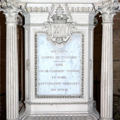 Er wurde dann auf ein Podest montiert, das von zwei Steinmetzen aus dem Tonnerrois, Auguste Méchin (aus Tonnerre) und Clément Marcoux (aus Cry-sur-Armançon), gemeißelt wurde und dazu bestimmt war, einen Reliquienschrein aufzunehmen, in dem die Überreste der Schutzheiligen der Grafen von Tonnerre ruhen, die auf jeder Seite eingemeißelt sind.