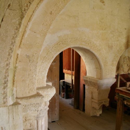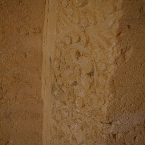Las figuras consisten en una cabeza de hombre con bigote sobre un busto de mujer alada que termina en una cola de león azotando y patas con garras. Situado originalmente al fondo de la nave, fue trasladado en 1847 al fondo de la nave, frente al altar mayor. En esta nueva posición, oculta la ubicación del portal románico del siglo XII, que se incorporó al muro oeste.