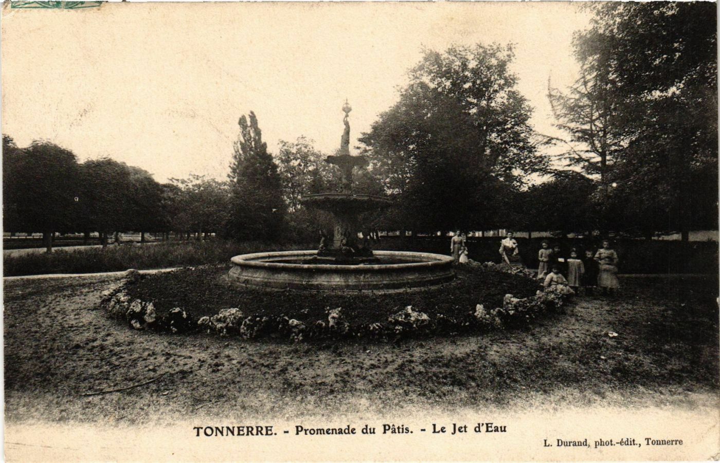Comme une des conduites de ce nouveau réseau doit traverser le Pâtis, on profite de ce chantier pour construire sur la promenade un jet d'eau, afin d'égayer ce lieu très fréquenté des Tonnerrois et des voyageurs. L’ingénieur en charge du projet opte pour un « château d’eau », constitué de vasques et surmonté en son centre d’une statue. Il choisit dans le catalogue de la maison Barbezat le modèle le plus adéquat. En 1880, la fontaine est installée. Ne reste plus qu’à aménager ses abords en creusant des aqueducs ouverts et bordés de fleurs et de pierrailles, afin de donner à l’ensemble un charme bucolique.