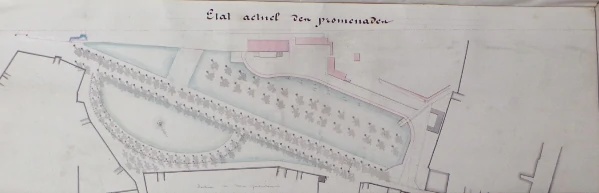 Dessin du Pâtis dans la première moitié du 19e siècle. Au centre du terre plein en arc-de-cercle, appelé depuis la Révolution le « Champs de Mars », le jet d’eau sera installé en remplacement de la colonne dédiée au retour des Bourbons.