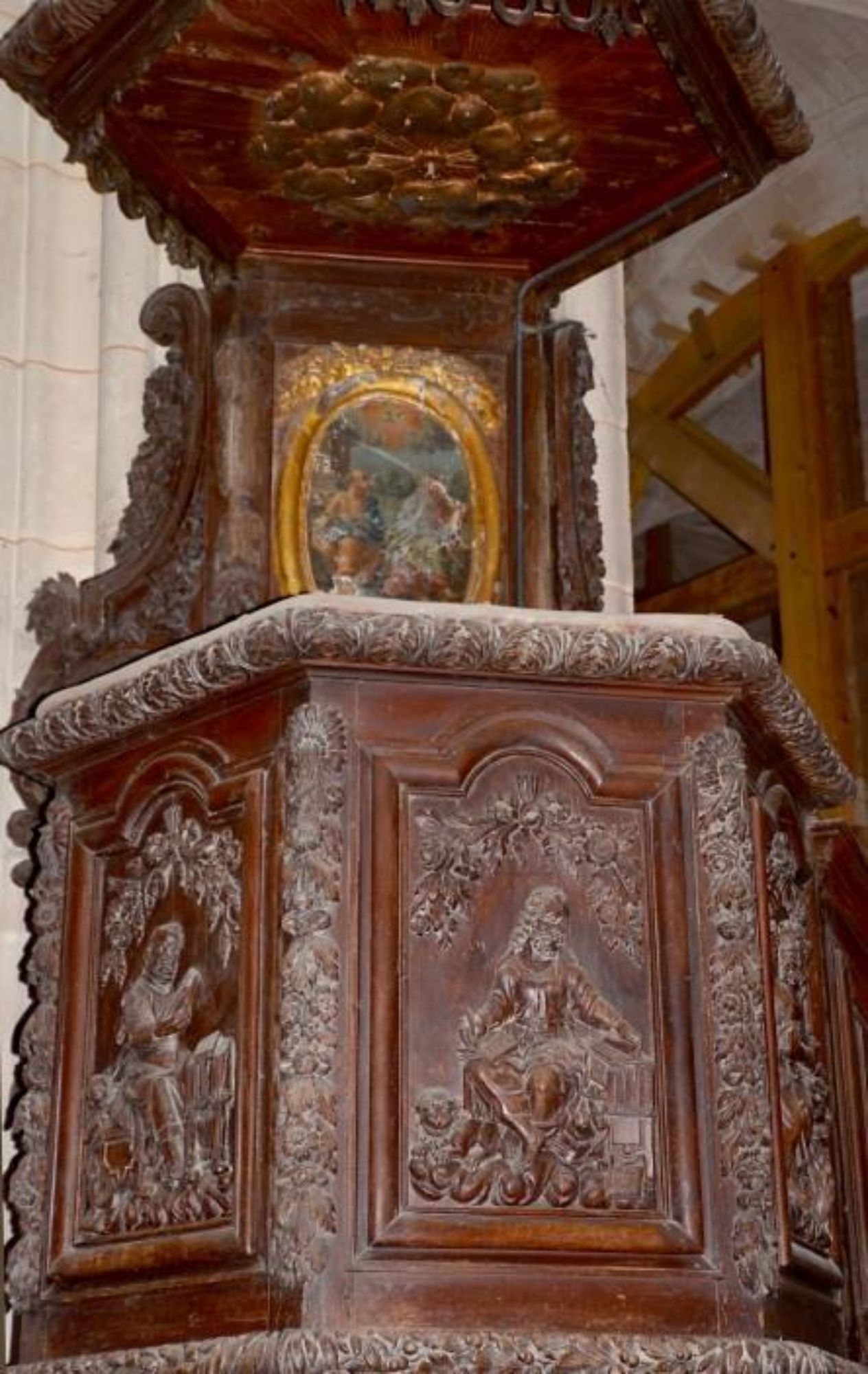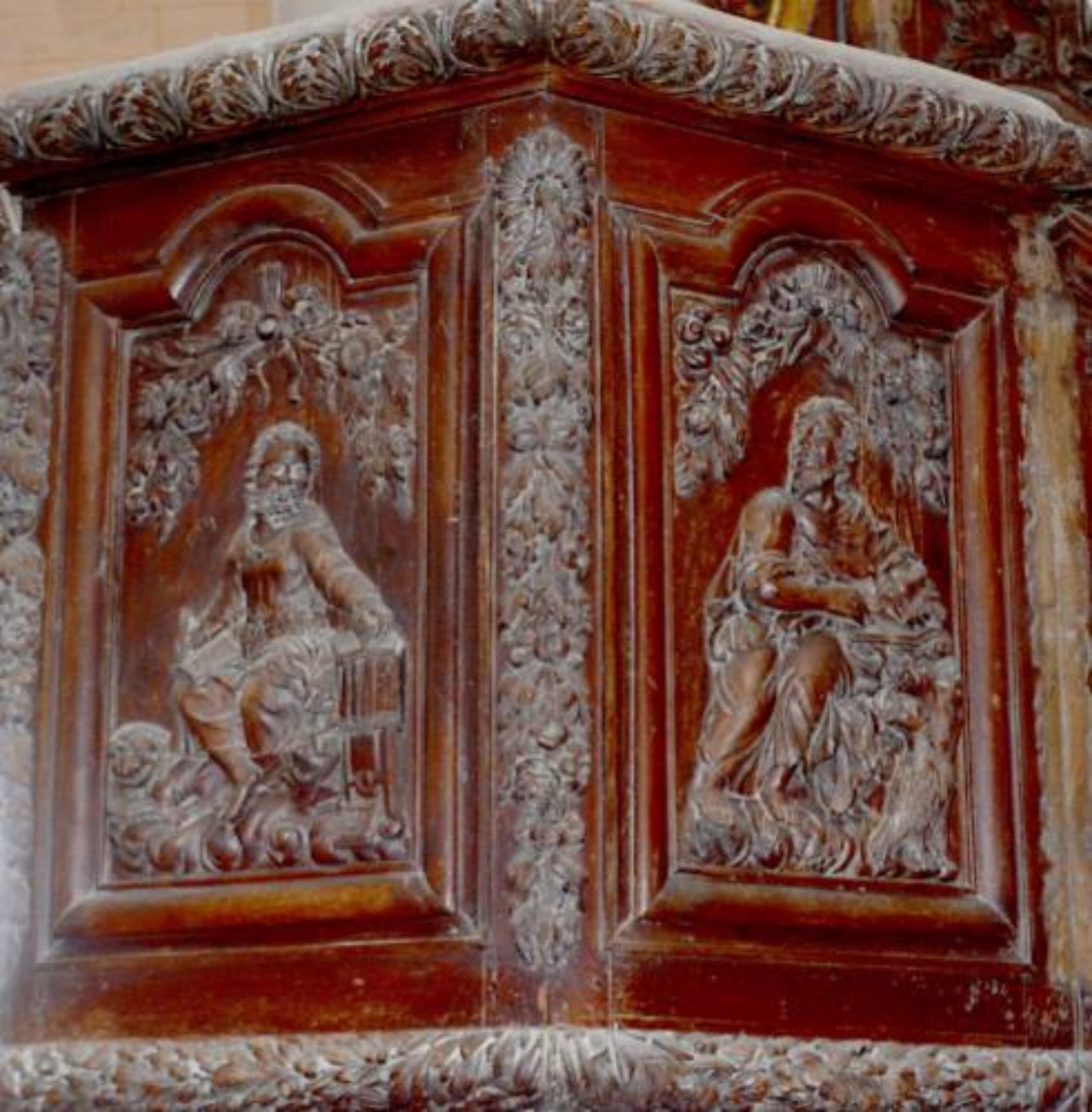 Het bovenste gedeelte is van goed, eerlijk vakmanschap, en de decoratieve elementen van de pilasters en consoles - wijnbladeren en druiventrossen - zijn zeer elegant. Maar het zijn de panelen van de galerij die de meesterwerken zijn. Behandeld als bas-reliëfs en gesneden uit eiken planken, stellen ze de 4 evangelisten voor met hun traditionele attributen (van rechts naar links): Sint Johannes en de adelaar, Sint Marcus en de leeuw, Sint Mattheüs en de engel, Sint Lucas en de os.